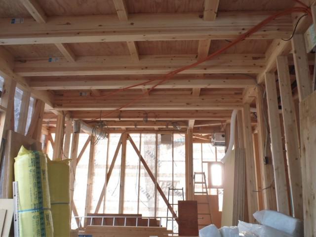 ・内部木工事、2階壁断熱材入れ、1階天井下地組み及び下屋