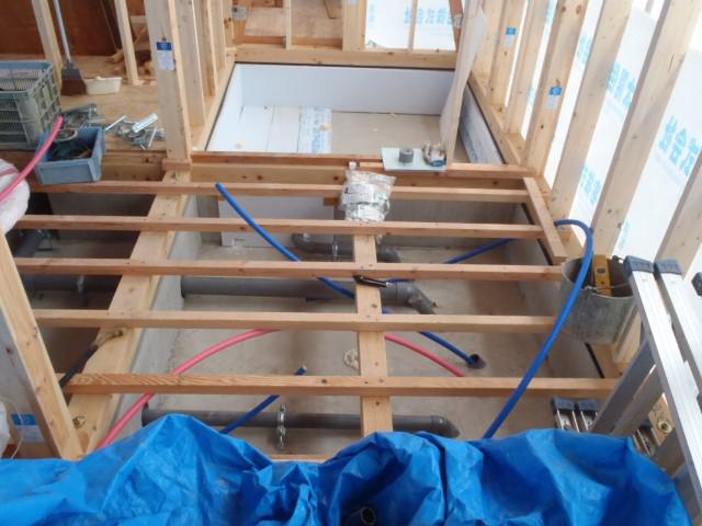 ・屋根工事、荷揚げしたカラーベストを葺き、太陽光パネル設置後、 廻りの部分を葺きます。 ・内部給排水・給湯配管を終え、床断熱材入れ・下地合板 本締め、軒天下地組みと木工事行っています。