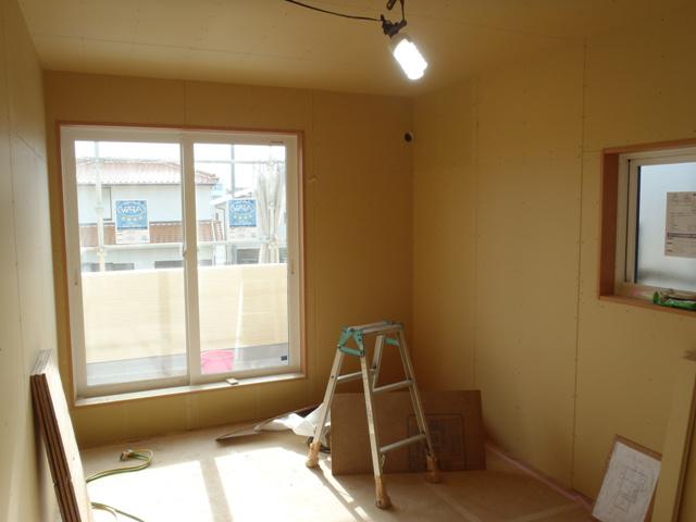 ・内部木工事、2階、壁下地合板、プラスターボード貼りがほぼ完了