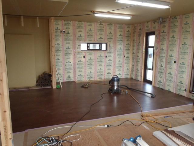・内部木工事、組み行った窓枠取付を終え、床フローリング貼り
