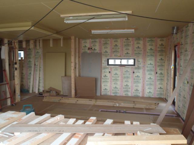 木工事(壁断熱材入れ、窓枠取付け、床フローリング貼り