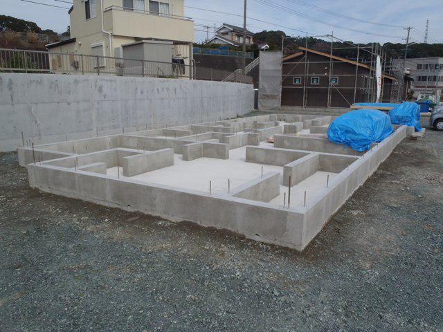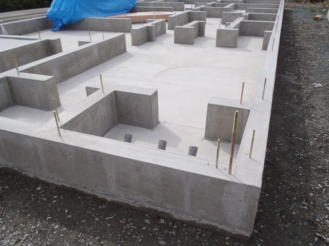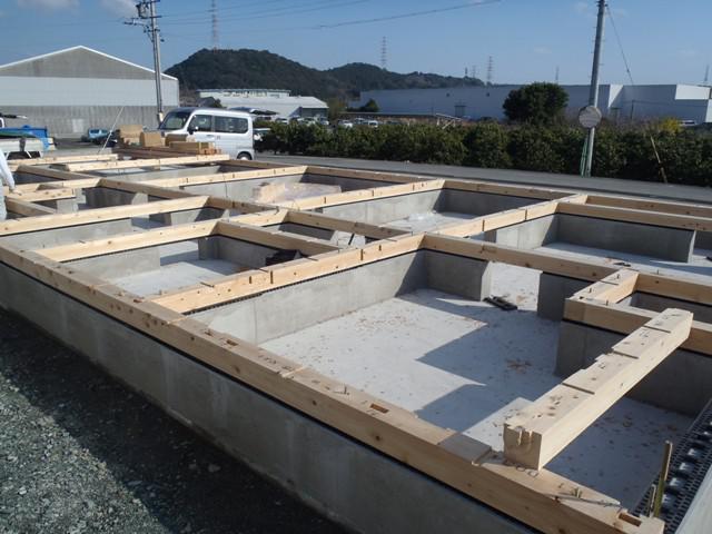 ・基礎コンクリートの色も白くなり強度が徐々に出てきています、 基礎に土台を据える基準墨を出し、基礎パッキン入れ、土台 据え、1階床下地組みと上棟準備を行っています。