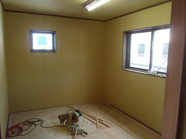 付けボード貼りを進め貼り終えた部屋より回し縁・幅木取付