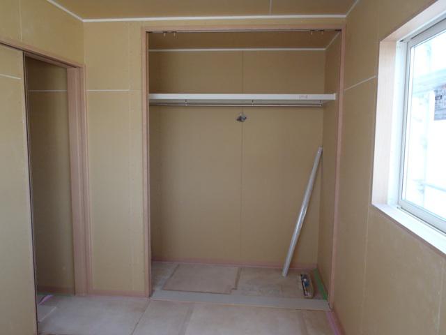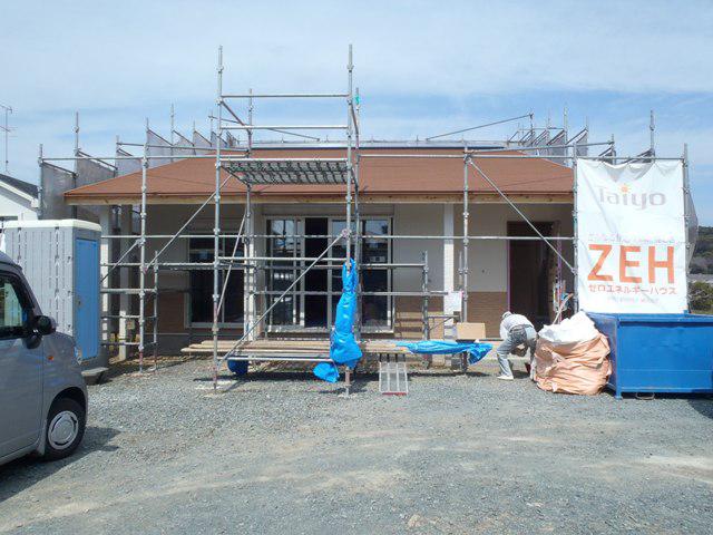 ・外部工事、破風鼻隠し板金、軒樋・縦樋掛け完了しました、 外部点検し来週末、外部足場解体を行います。 内部木工事、階段造作を終え、壁ボード張りを終えた部屋 より、回し縁幅木取付、固定棚類取付を行っています。