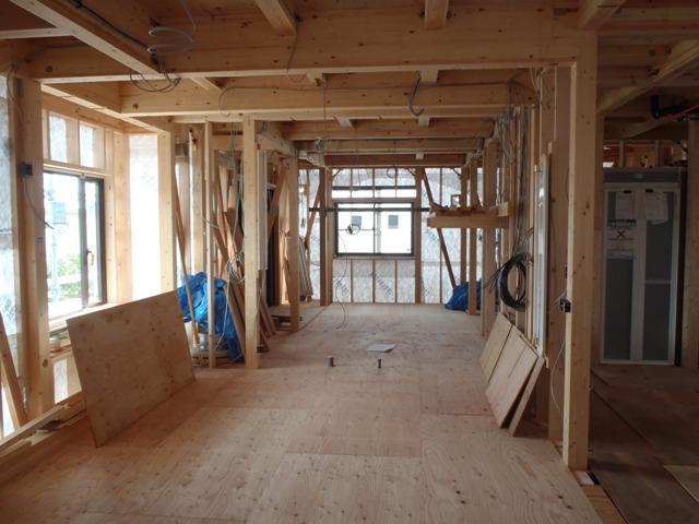 建物を覆うように貼り終え、外壁下地木材打ち、2階天井下地組み 及びボード貼り、内部給排水を終え1階床下断熱材入れ、 床下地合板本締めと天候にて、内部・外部と造作行っています。