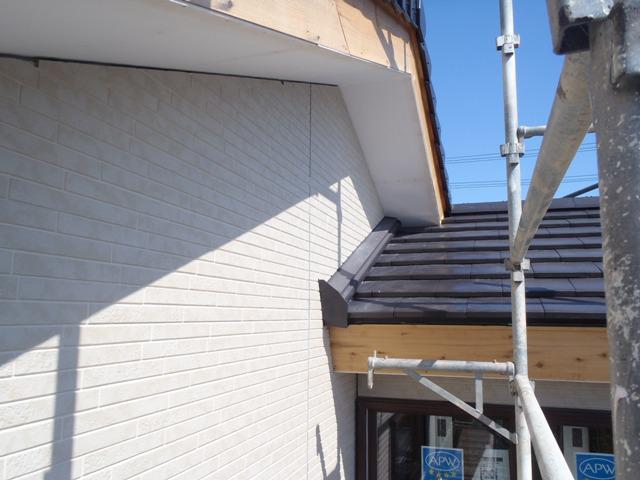 サイディング材ジョイント部、軒天取り合いコーキング打ちへと進めます。 木工事、天井ボード貼りを終え、2階床フローリング下地、
