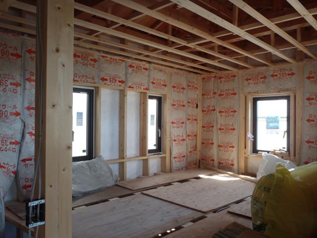 フローリング貼りを進め貼り終えた部屋より 床養生敷き込みしてあります、壁断熱材入れ、窓枠組み取付、