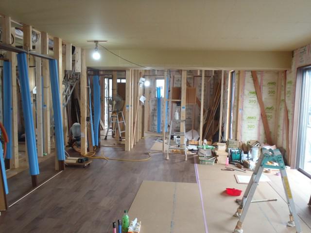 内部木工事、1階フローリング貼りながらドア開口枠組立 仮設置