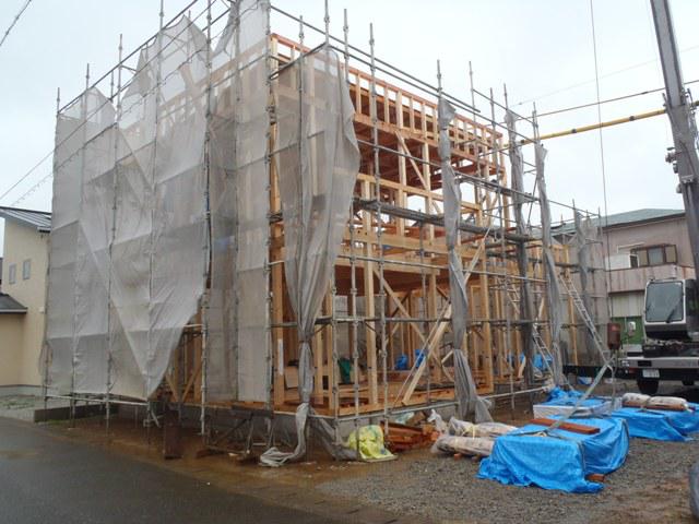 ☆先週の工事☆ 木工事(土台据え、床下地組み、上棟準備、他) 上棟 先行足場組み ☆今週の予定工事☆ 木工事(屋根下地プラスターボード敷き、ルーフィング葺き 筋カイ・間柱入れ、他)