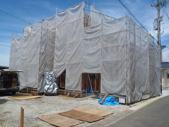 外部壁ボード貼り、外壁透湿防水シート貼り・土台水切取付、