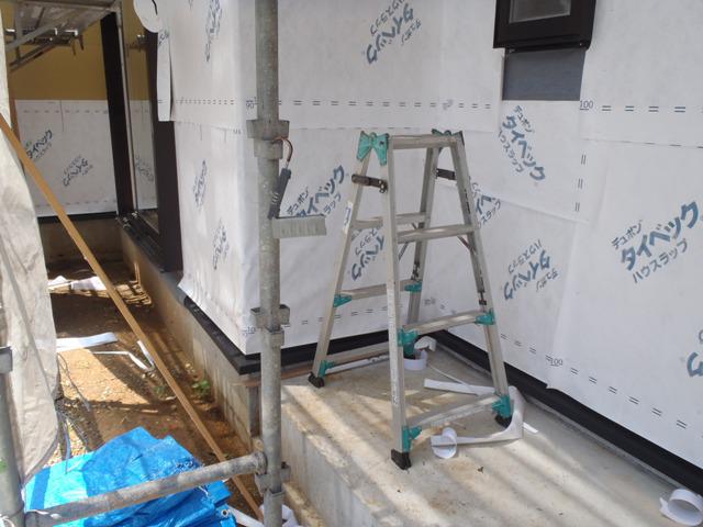 ・外部工事、土台水切り板金取付、外壁下地(透湿防水シート)を