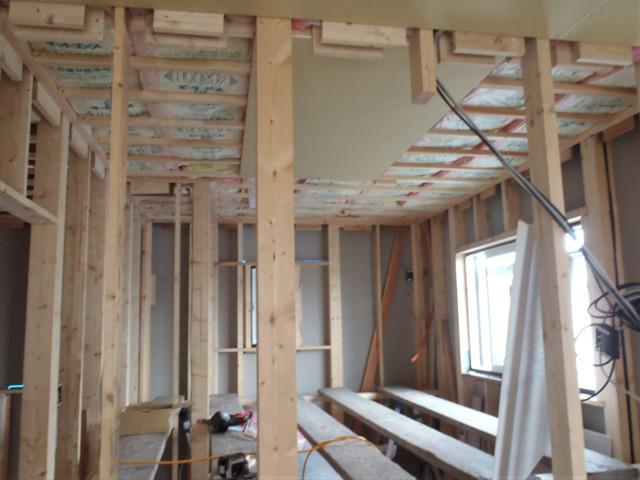 2階天井断熱入れ、天井ボード貼りを終え、外壁材下地木材