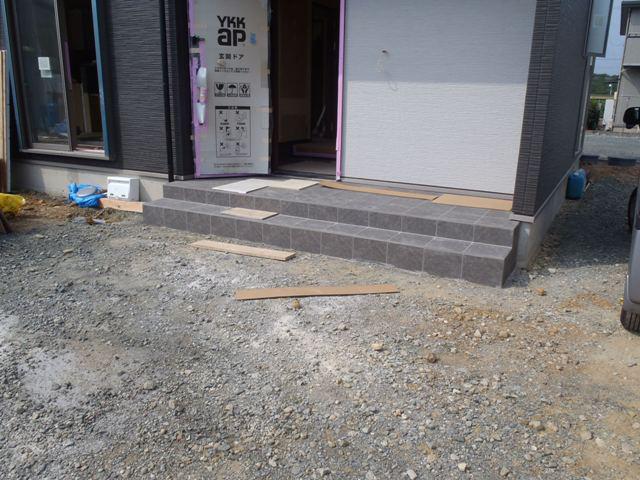 と進んでいます、玄関・ポーチ タイル貼り・目地入れを終えま