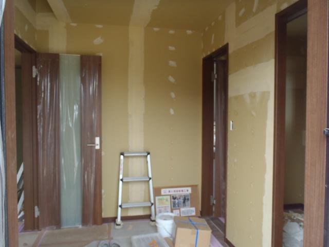 同時進行にて、クロス下地・パテ入れ、クロス貼りを進めています。