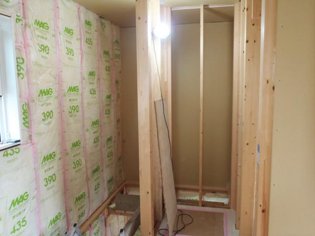 木工事(壁断熱材入れ、窓枠・ドア枠組立、取付、壁下地合板・