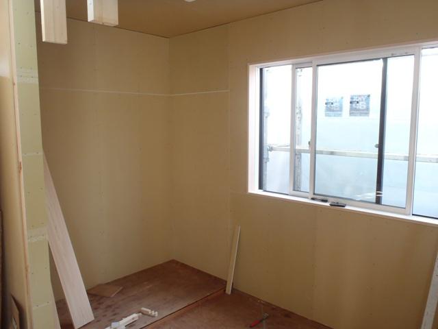 ・内部木工事、1階壁合板・ボード貼り大まかな部分を終え、