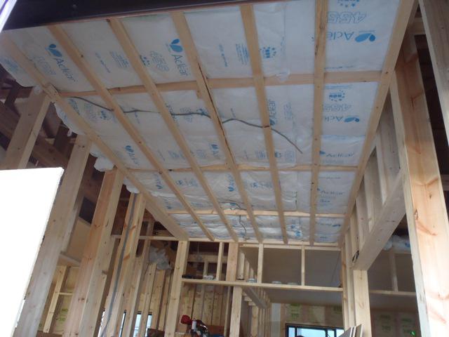・内部木工事、天井下地組み、断熱材入れ、天井ボード貼りを