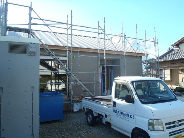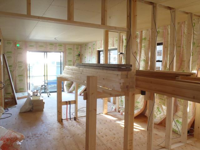 進めています。 壁断熱材入れ、床フローリング貼りへと行って