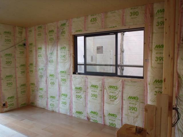 込み、壁断熱材入れ、 壁プラスターボード貼りを行っています。