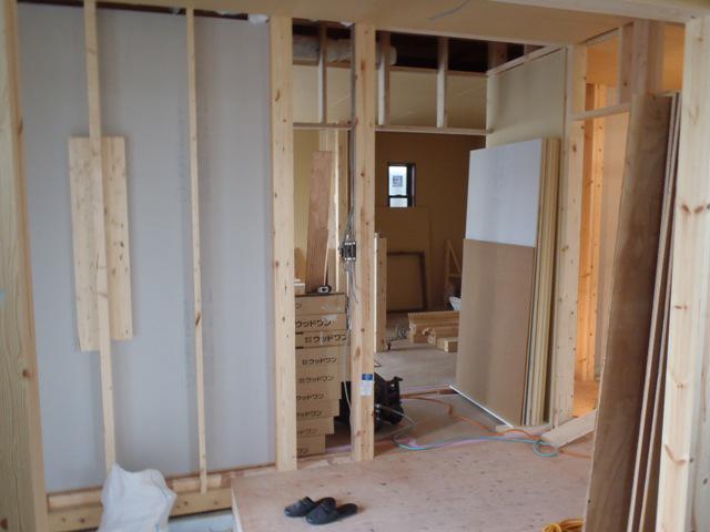 ・外部足場を解体し、電力引込を行いました。 内部木工事 窓枠取付、壁下地合板・プラスターボード貼りを進め、間仕切り 壁が出来て行きます。 ドア開口枠組立・取付しながら枠 取り合い壁納めます。