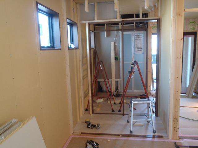 ・内部木工事、建具枠取付ながら取り合い壁を納め各部屋が 間仕切られて行きます。 ・20日キッチンカップボード据付、22日キッチン据付を行いますので 下地壁、カウンター笠木取付を進めます。