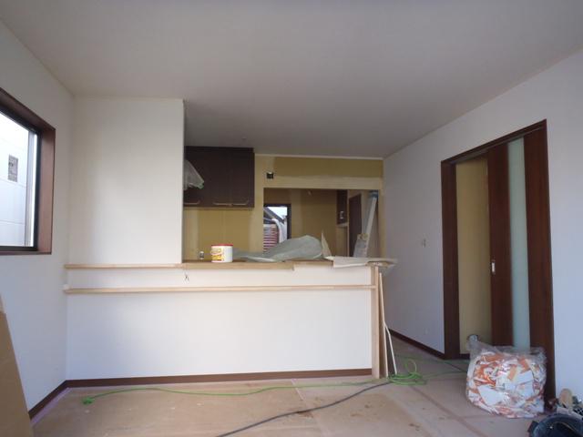 ・内装仕上げ工事、クロス下地・パテ入れし天井・壁とクロス貼りが