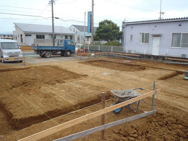 ・地鎮祭おめでとうございます。 地盤調査し、しっかりとした 地耐力を確認し基礎工事へ着手しました。 ・建物基準(基礎高さ)、建物位置出し 丁張を行い、掘削作業を 行ってます。