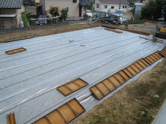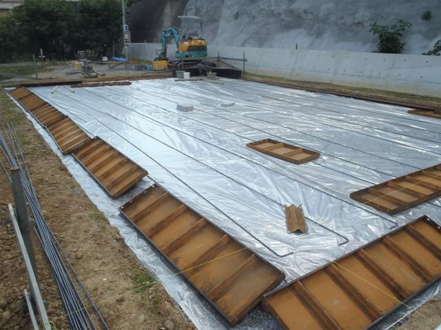 ・基礎工事、砕石地業、土間シート敷きを終え、ベース型枠組み 鉄筋加工へ入りました。 鉄筋組み、給排水土間にげ配管を 終えましたら 保証機構JIO配筋検査(鉄筋組み状況、型枠と 鉄筋との間隔等確認)を受け、ベースコンクリート打ちを行います。