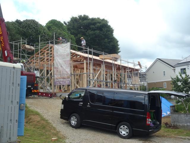 ・上棟おめでとうございます!天候にも恵まれ 柱・梁・小屋組み、 屋根下地と行う事が出来ました。 木工事、宜しくお願いします。 ・屋根工事、下地防水紙ルーフィング葺き、カラーベスト葺きに入ります。