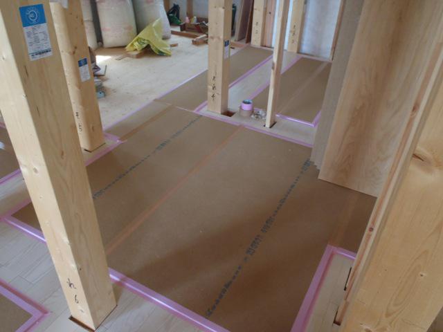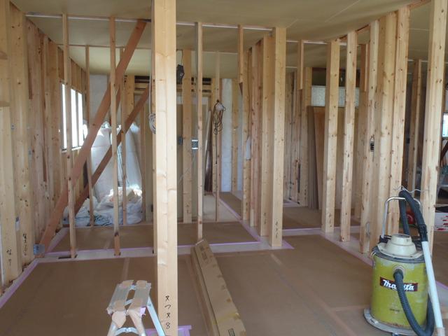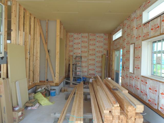 ・内部木工事、床フローリング貼り、壁断熱材入れを進めています。