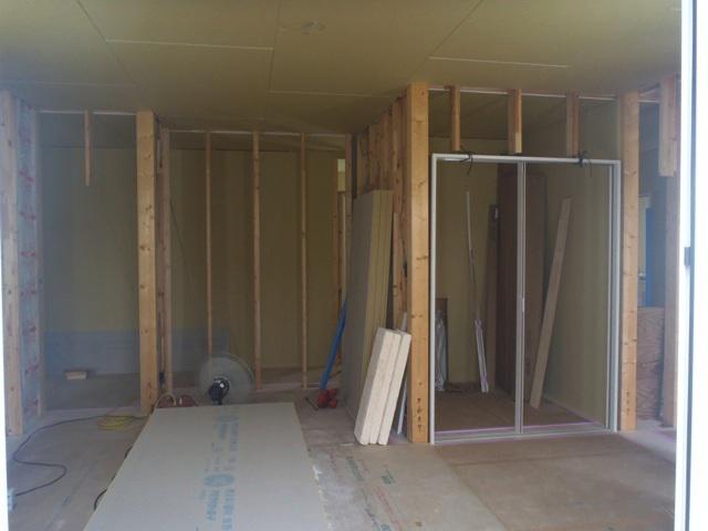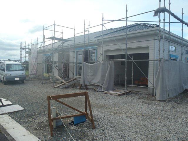 ・夏季休暇を頂きありがとうございます。 外部換気フード類取付行いましたら外部足場解体をします。 ・内部木工事先週より引き続き壁断熱を納めドア開口枠取付 ながら壁下地プラスターボード及び下地合板貼りを進めて います