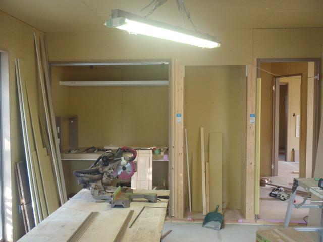 ☆木工事(ドア開口枠組み、壁ボード・下地合板貼り、 幅木・回し縁取付、他) 外壁工事(サイディング貼り、コーキング打ち、他) ☆今週の予定工事☆ 木工事(幅木・回し縁取付、固定棚類取付、他) 外壁工事(コーキング打ち、他) 軒天塗装