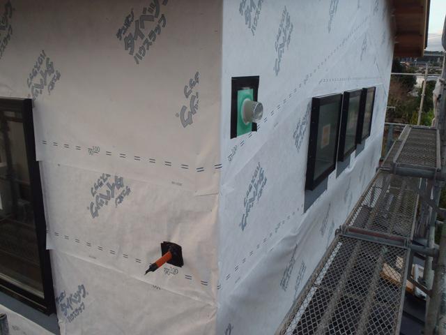 木工事(壁断熱材入れ、外壁下地材打ち、軒天下地組み、