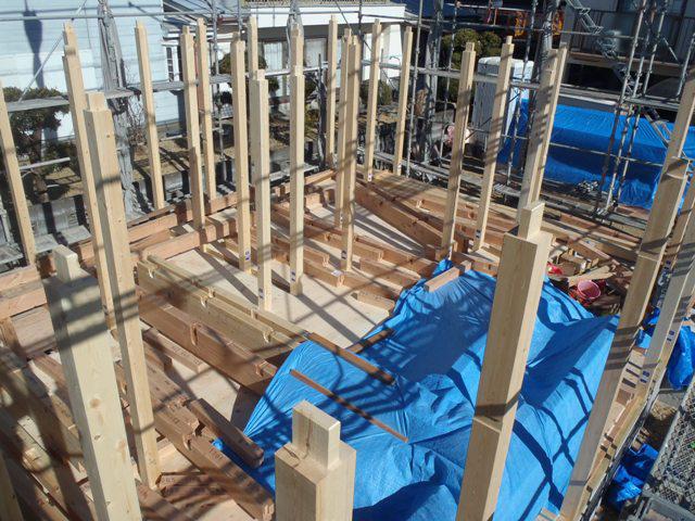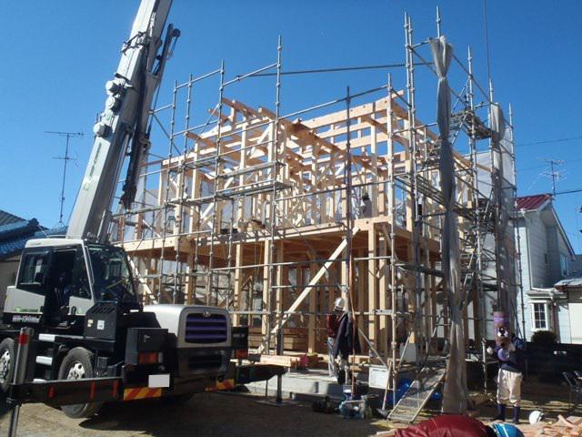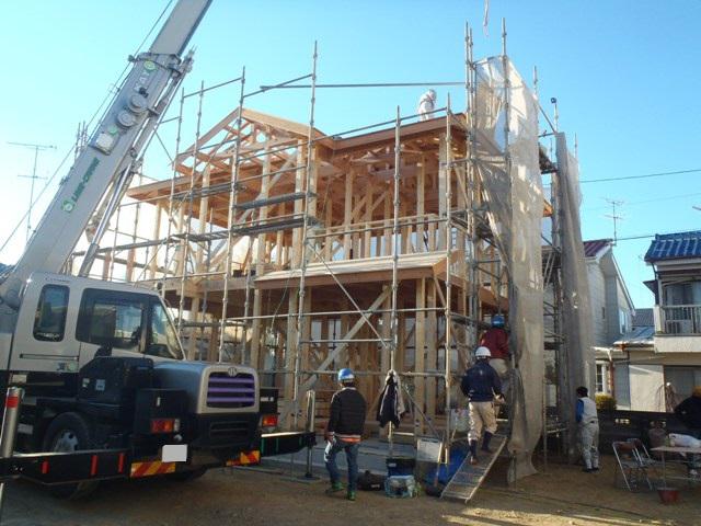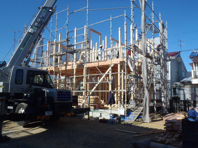 ☆先週の工事☆ 土台据え、1階床下地組、上棟準備 先行足場組み 上棟 ☆今週の予定工事☆ 木工事(筋カイ・間柱入れ、構造金物取付、サッシ開口 造作、他)