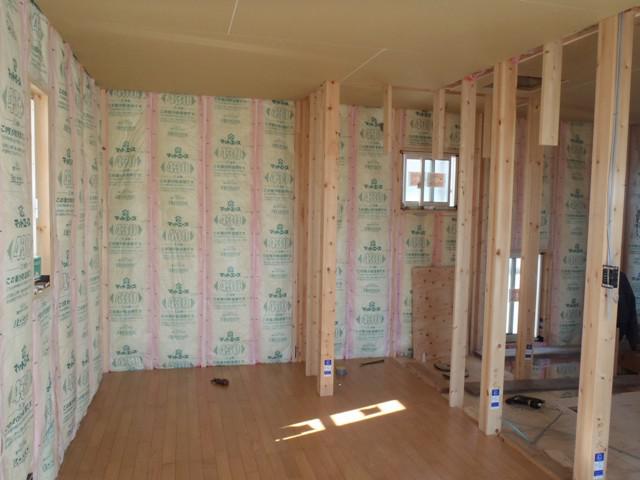 ☆先週の工事☆ 木工事(外壁下地材打ち、壁断熱材入れ、床フローリング 貼り、他) ☆今週の予定工事☆ 木工事(外壁下地材打ち、軒天下地及び軒天ボード貼り、 床フローリング貼り、窓枠取付、他) ユニットバス据付