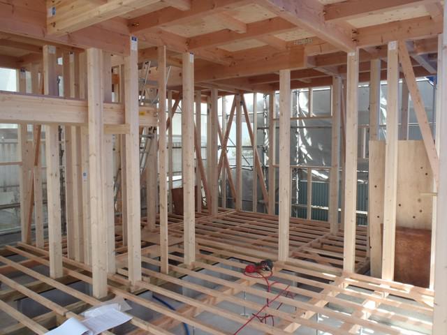 ☆先週の工事☆ 上棟 木工事(筋カイ入れ、構造金物取付、サッシ開口 造作) 屋根工事(荷揚げ・捨て板金・カラーベスト葺き 他) ベランダFRP防水 防腐防蟻処理 ☆今週の予定工事☆ 木工事(窓サッシ取付、床断熱材入れ、軒天下地組み、他) 保証機構・検査機構(中間検査) 外壁下地シート貼り