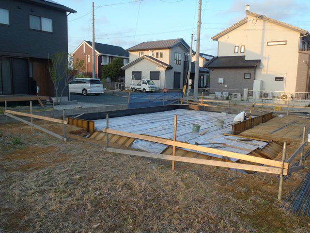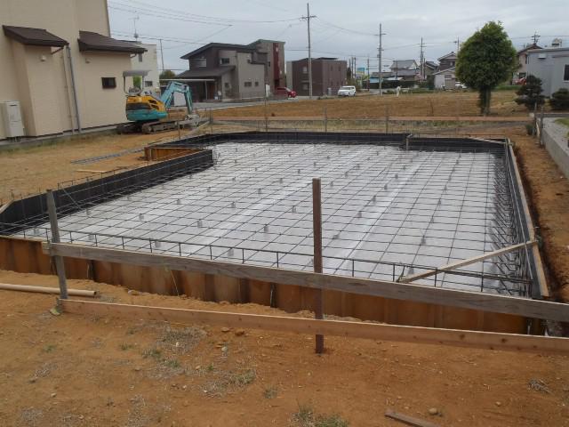 ・基礎工事、掘削・砕石地業、土間シート敷き、ベース 型枠組みを終え、鉄筋加工・鉄筋組へと入っていきます。 ・鉄筋組み上がりましたら、保証機構JIOによる配筋検査を 受けベースコンクリート打設します。