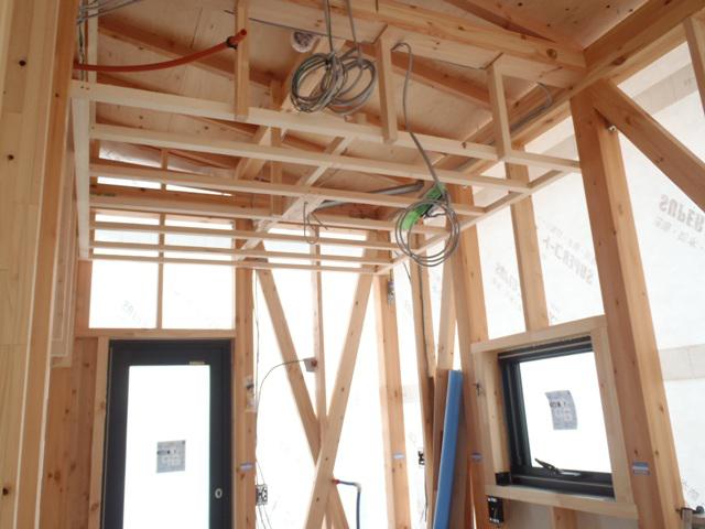 ・内部電気配線・配管があらかたとなり木工事2階天井下地