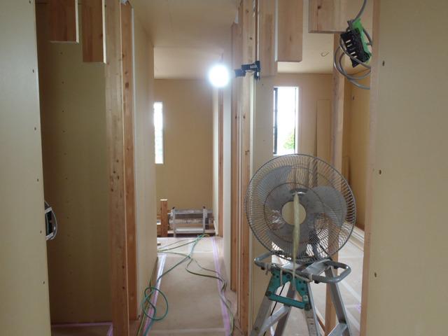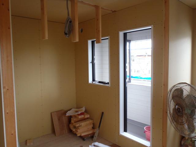 ・軒天塗装ありがとうございます。 ・内部木工事2階壁下地合板、プラスターボード貼りを進め 各部屋が間仕切りられてきました。 開口御枠組立・取付 ながら枠取り合い壁ボード納めていきます。 ・当社、夏季休暇を11日より17日まで頂きます。