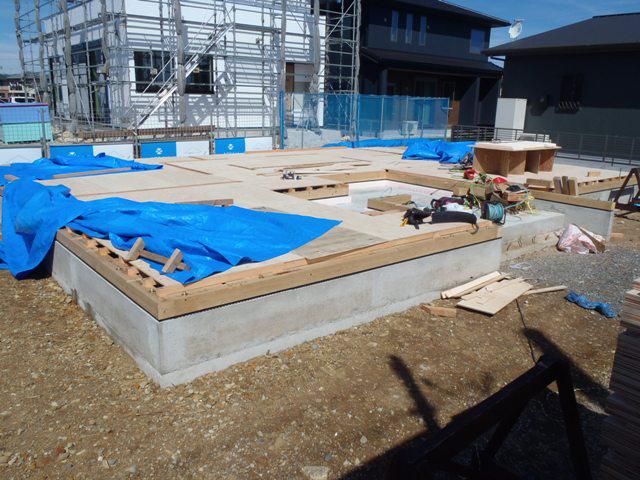 ・上棟に向け墨出し、構造材・下地木材搬入、土台据付・ 1階床下地組み、上棟準備を進めいよいよ上棟を迎えます。 ・柱・梁・小屋組みと構造材を組み上げ、建物高さ間取り 間隔等が確認できます。