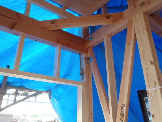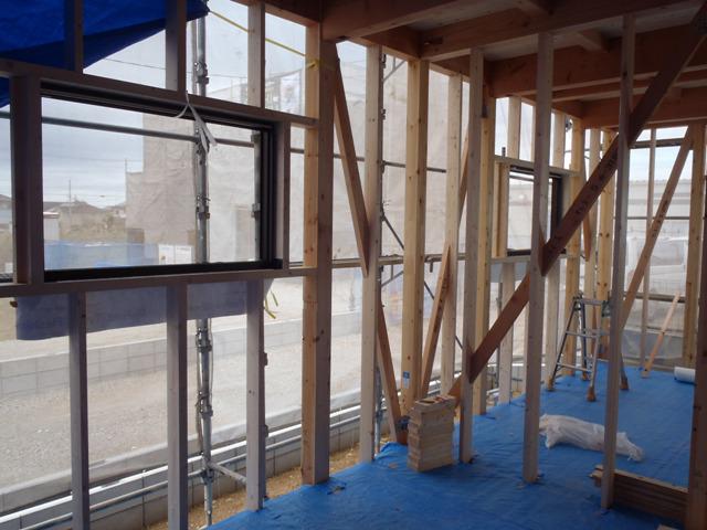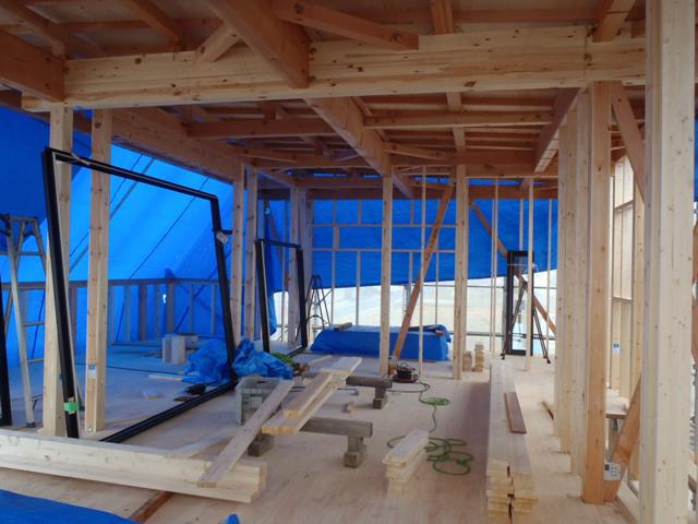 ・木工事、構造金物取付を終え、サッシ開口造作、サッシ下 先貼り防水処理を行いサッシ取付を進めています。 ・サッシ取付後、ベランダ下地造作、FRP防水、床下防腐防蟻 処理へと行います。 ・中間検査(建築検査機構・保証機構JIO)を受けるタイミング となりますので書類作成・検査申請を進めます。