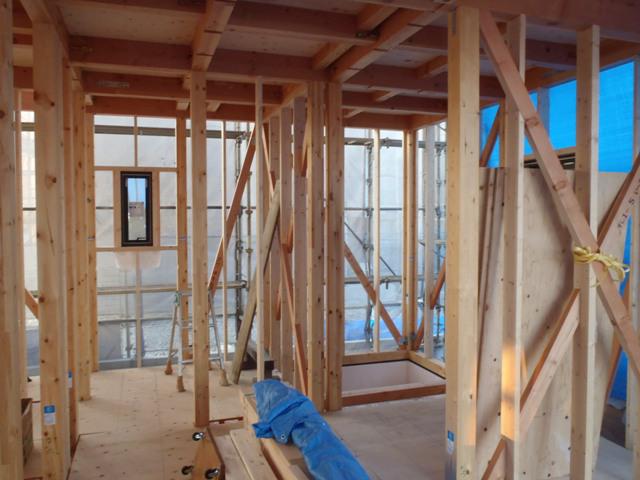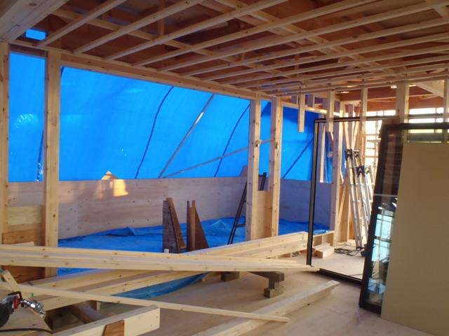 ・木工事、サッシ取付、ベランダ下地造作、壁下地材打ち、 防腐防蟻処理を行いました。ベランダFRP防水後、取り合い サッシ(AW-11・AW-12)取付検査機構(中間検査) 保証機構JIO(構造躯体検査)を受けます。
