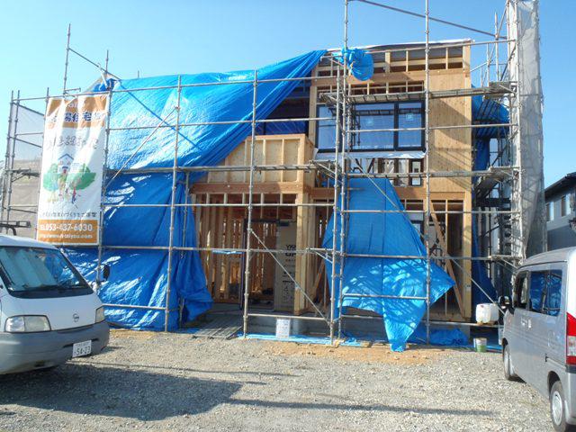 ・木工事、ベランダFRP防水、検査機構・保証機構による 中間検査を受けました。 ・外壁下地シート貼りを行い構造材等 雨水にて濡れなくなり 内部給排水・電気配線配管天井断熱材入れ、天井ボード貼り へと進めて行きます。