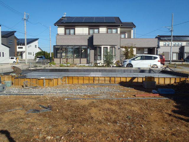 ・基礎工事、砕石地業、土間シート敷き、ベース型枠組み、 鉄筋加工・鉄筋組みを進めています。 ・鉄筋組み完了後、保証機構による配筋検査を受け、ベース コンクリート打ちを予定しています。