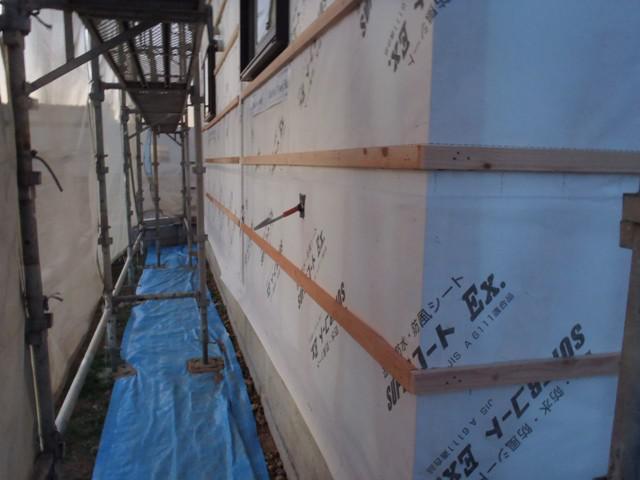 ・29日ユニットバス据付を行いました、浴槽側面パネル等 仕上げ工事時に接続及び通水点検の為開けてあります。 ・木工事床フローリング貼り、壁断熱材入れを行った部屋へ 壁プラスターボードを搬入しました。 ・外壁下地材打ちにも取り掛かりました。