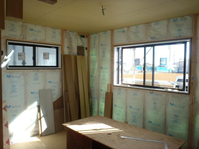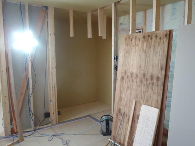 木工事(外壁下地材打ち、壁断熱材入れ、壁プラスターボード