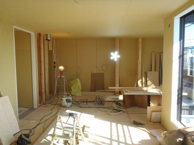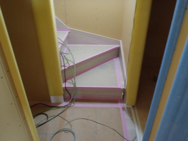 ・内部木工事、1階ドア開口枠・壁ボード類を納め、階段登り口