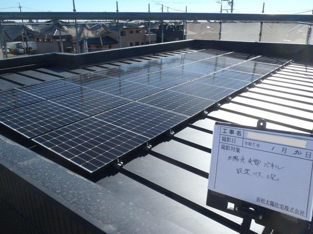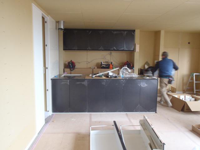 ・太陽光発電パネル設置・パネル結線引込を行い外部足場解体 となります。 ・内部木工事、幅木・廻し縁・固定棚類取付、建具吊込みを 終えました・デザインウォール・ポストフォームカウンター 取付を残し内装仕上げ工事へと入っていきます。