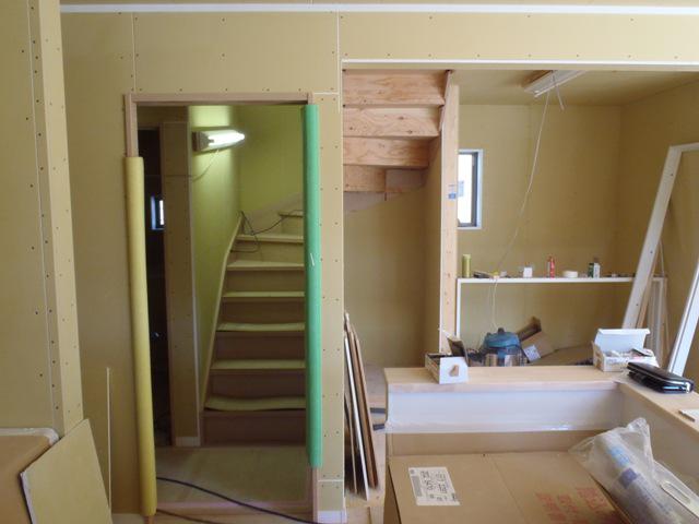 幅木・廻し縁取付、建具吊り込みを階段造作を終え、残工事