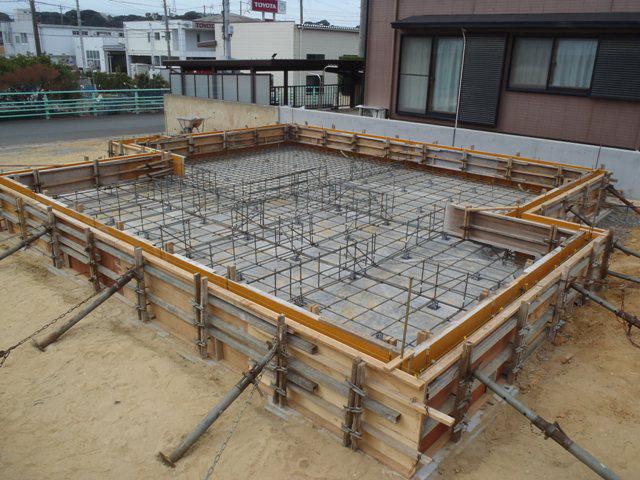 ・20日 保証機構JIOによる配筋検査(鉄筋組み状況、型枠との 間隔等確認)を受け、建物外周部内側型枠組み、給排水用 土間逃げ配管を設置しました。 ・基礎ベース部・立上り型枠部コンクリート打ち、内部布基礎部 型枠組み、アンカーボルト類設置へと進めて行きます。
